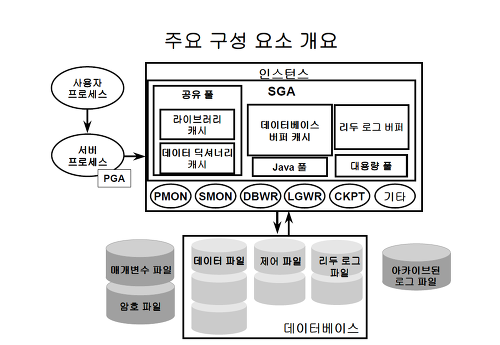 - SGA(System Global Area) : 서버 프로세스와 백그라운드 프로세스가 공통으로 엑세스하는 데이터와 제어 구조를 캐싱하는 메모리 공간이다.