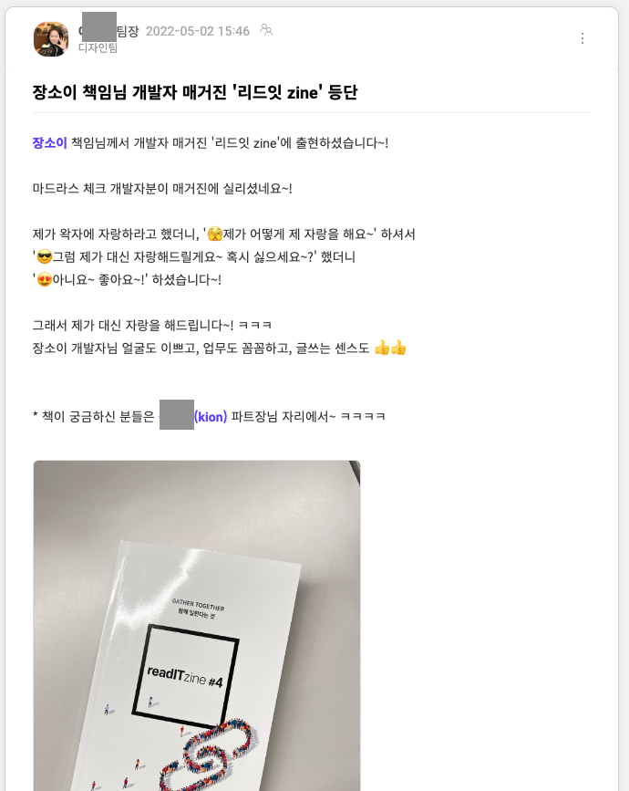그래서 이번에는 교보문고에서 출판하는 개발자 매거진에 도전했는데 감사하게도 바로 기회가 찾아왔다. 회사에서 대외적으로 글을 쓰는 사람이 처음인데 괜찮을까 걱정도 있었지만, 주위 분들도 긍정적으로 생각해 주시고 응원해 주셔서 다행이라는 생각, 그리고 참 감사한 동료들과 일하고 있다는 생각이 들었다. 그리고 우리 회사에 입사하기 전 공부를 위해 교보문고에서 개발서적을 샀다가 이 글을 읽었다는 신입 개발자 분들을 봤을 땐, 더 긍정적인 글을 자주 써야겠다는 생각도 들었다.