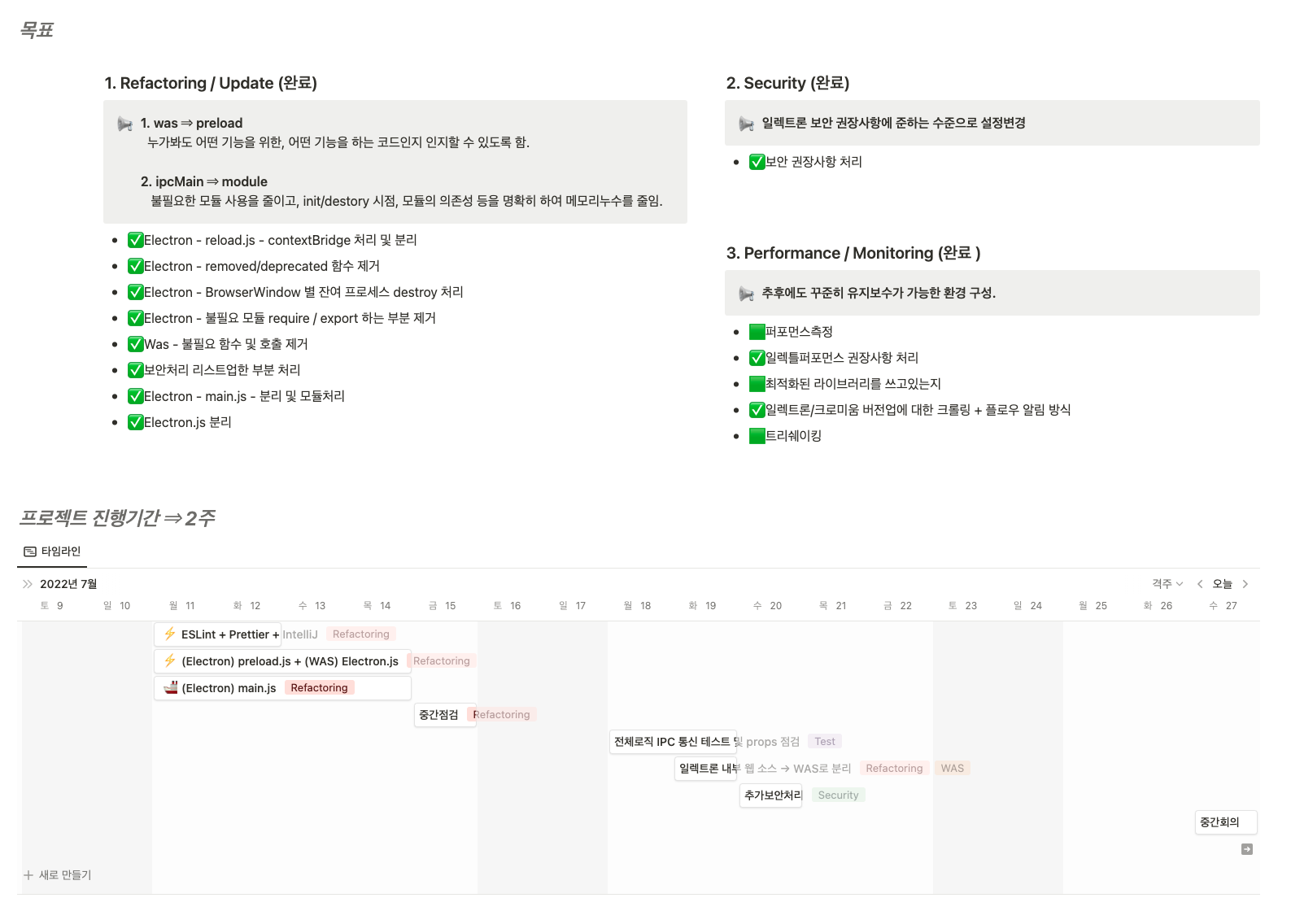 | 일렉트론 고도화 및 리팩토링 | Electron | 9월 ~ 10월 |