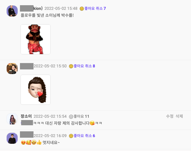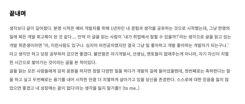 사실 회고록을 쓰고 끄적끄적 글을 쓰는 게 벌써 익숙해졌는지 '그저 지금을 기록을 하는 것이다'라는 생각으로 글을 쓰곤 한다. 하지만 2년 전, 잘 다니던 회사를 퇴사하고 1년의 개발 공부 끝에 취업준비를 하던 시절의 나를 생각해 보면 정말 불안했고, 다른 개발자들의 글을 읽으며 용기를 얻었고, 나도 누군가에게 좋은 영향을 주고 싶다는 생각을 했다. 그랬던 내가 누군가에게 글로써 용기를 줄 수 있는 사람이 되었고, 기록할 수 있는 무언가가 있고, 함께하는 사람들과 응원해 주시는 분들이 있다는 게 정말 감사하다. 그런 의미에서 이 글을 보는 당신도!! 글을 쓰는 건 정말 추천 추천 대추천이다!!