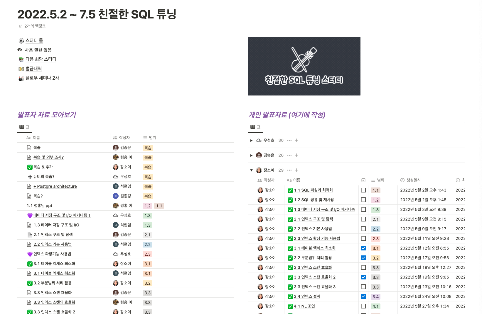 하지만 막상 취업을 하고 나니 내가 하는 일과 큰 관련이 없으면 공부를 깊게 못하게 되는 것 같아 급한 불부터 끄고자 SQL에는 손을 놓고 있다가, 위에서 언급한 업무개선을 위해 SQL 튜닝이 필요해졌다. 취미로 하는 것과는 달리 업무에 바로 적용해야 했기에 이왕이면 함께 고민을 하고 성장을 하기 위해 사내 스터디를 모집하기로 했다.