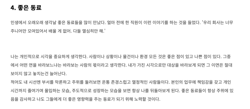 그래서 누군가에게 업무적으로 손 내밀고 싶을 때 적어도 누군가 옆에 있고, 업무와 사회생활에 작은 방향성이라도 제시해 주는 것, 내가 하는 일에 대한 가치를 알아주는 사람이 있다는 것, 말로 조언해주지 않아도 본보기가 되는 사람이 옆에 있다는 것 등등이 얼마나 회사생활에서 큰 영향을 미치는지를 알고 있다.