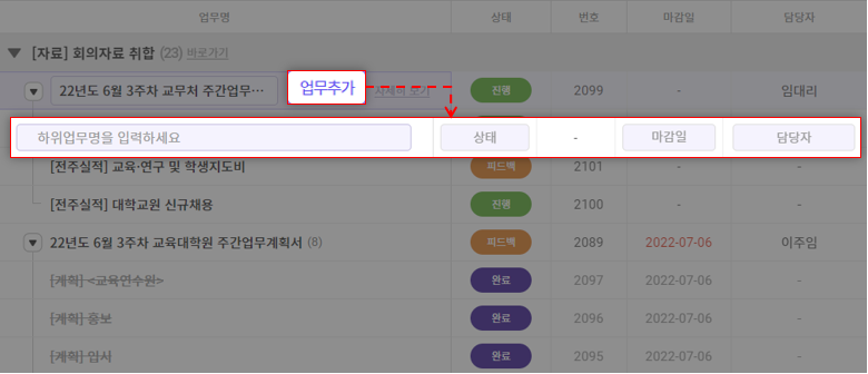각 업무가 가진 업무명, 업무 상태, 진척도, 마감일, 담당자 등의 항목을 바로바로 리스트에서 수정할 수 있고 (왼쪽사진), 하위 업무를 추가할 수도 있게 개발을 하게 되었다(오른쪽). 조회만 가능했던 리스트에 수정 기능을 붙이는 건 새로운 기능을 만드는 것이나 다름없었다. 이때 주어진 기간은 2개월뿐이라서 정말 급하게 api를 찍어내고 프론트 처리를 했다. 지금 생각해 보면 아무리 급했어도... 그렇게 찍어냈으면 안 되었다..