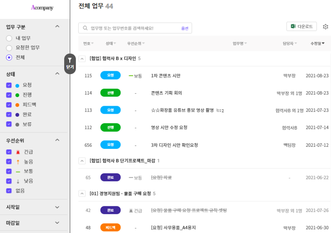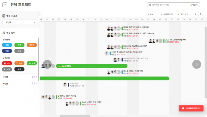 - 그룹/상하위/필터/정렬 등의 기준을 '전체업무'와 동일한 수준으로 변경