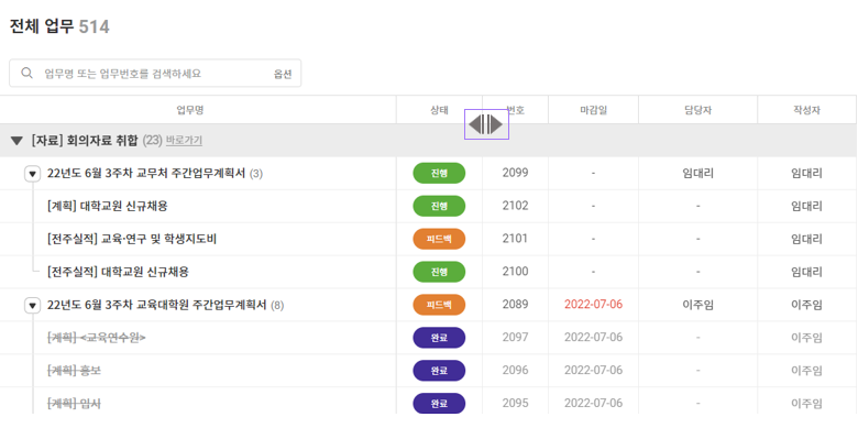 우리 서비스의 리스트는 각 '컬럼'을 기준으로 오름/내림차순을 이미 설정할 수 있었기 때문에, 두 기능 간 충돌이 나지 않도록 작업해야 했고 '필터'에 의해 리스트에서는 조회되지 않는 업무들도 드래그로 인한 순서변경에 영향을 받아야만 했다.