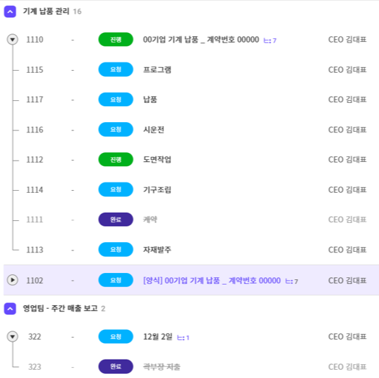 개발자의 입장에서 위 기능을 보면 묶음의 기준이 '프로젝트 - 그룹 - 상위업무 - 하위업무'로 4 뎁스가 되고,
