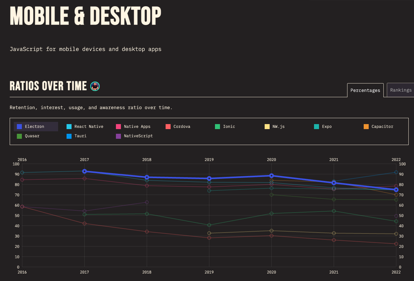Electron 은 https://releases.electronjs.org/ 에서 볼 수 있지만 활발한 업데이트가 이뤄진다. 물론 그만큼 버그도 자주 발견되지만, 바로 버그 픽스 릴리즈가 올라와 매번 따라가기 힘들 정도이기도 하다. 또한 데스크탑 애플리케이션을 위한 다양한 프레임워크 중에서도 오랜 기간 인기를 얻고 있어 그만큼 커뮤니티와 정보가 비교적 많은 편이다.