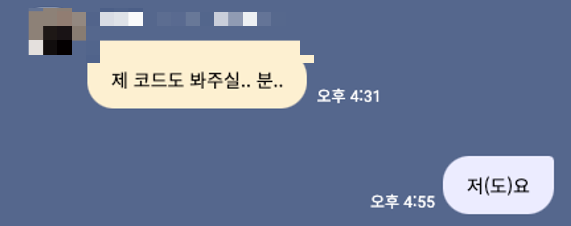 코드리뷰에 대한 필요성을 인지하고있던 팀원들과 모여 논의한 내용을 바탕으로 작성했고, 대면으로 모여 리뷰를 받는 방법을 시도했던 것 같습니다. 하지만 이또한 역사속으로 사라졌습니다.