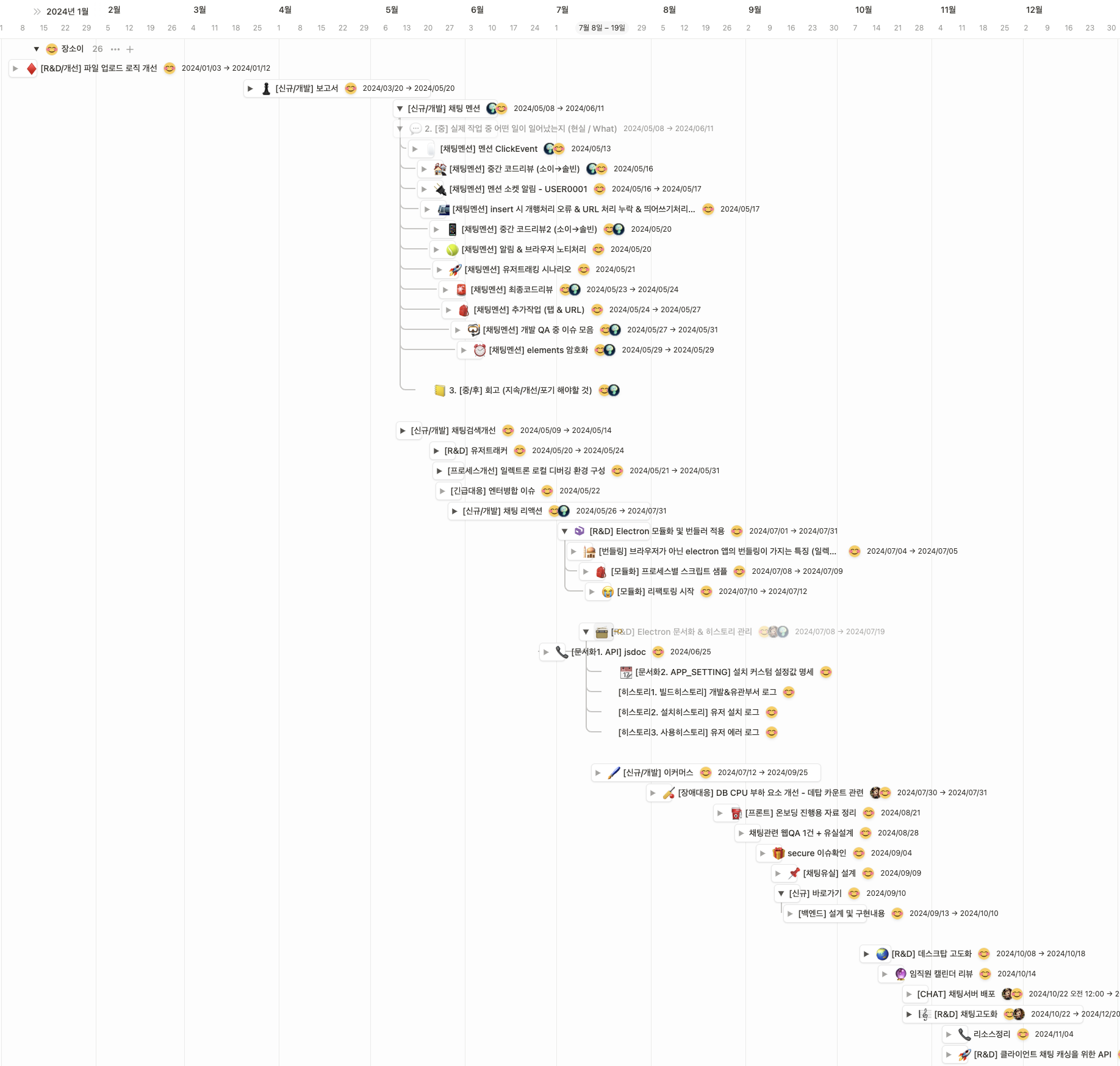보고서 기능은 프로젝트 내에서 축적된 데이터를 바탕으로 업무 진행 추이, 담당자별 업무 건수 등의 정량적인 지표를 확인할 수 있는 일종의 프로젝트 대시보드와 같은 기능이다. 기존에 개발되었던 '인사이트'라는 기능을 더 확대해서 개발하는 부분이었다. 기능적 특징이 뚜렷하다 보니, 당시에 개발적 메인 주안점을 잡고 달성하기 위해 노력했던 것이 기억난다.