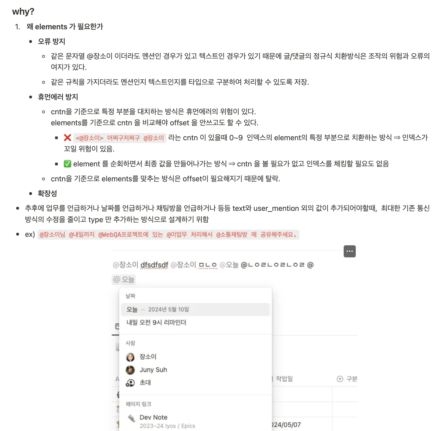 멘션기능에서 가장 오랫동안 고민하고 연구했던 부분은 바로 데이터 저장방식의 선택이었다. 풀스택인만큼 프론트 백엔드 구조에 대한 고민이 다방면으로 필요했기에, 사전에 멘션 기능을 갖고 있는 다양한 서비스의 방식들을 조사해 보았지만 우리 툴에 적용할만한 딱 맞는 통신 형태와 방식은 당연하게도(?!) 존재하지 않았다. 가장 적합한 방식을 설계한 뒤 각 클라이언트 개발자들과 굉장히 많은 대화를 하며 협업했다.