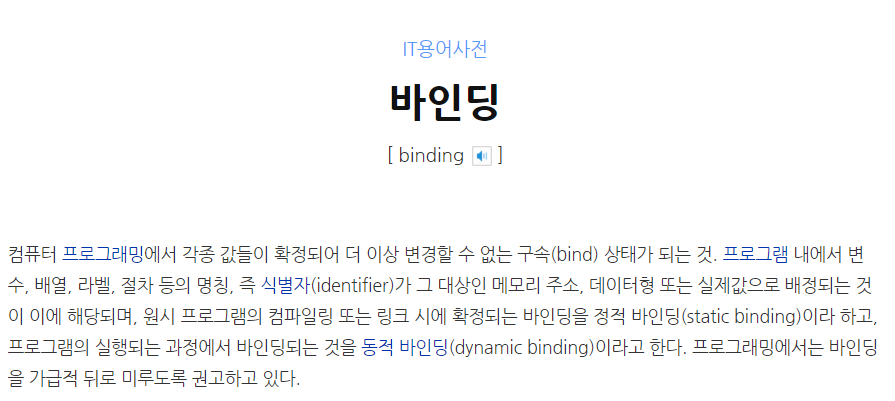 네이버 지식백과에서 찾아보면 바인딩은 '컴퓨터 프로그래밍에서 각종 값들이 확정되어 더 이상 변경할 수 없는 구속(bind) 상태가 되는 것' 으로 설명되어있다.