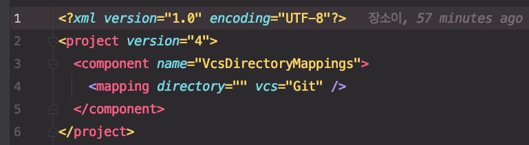 - vcs.xml - IDE는 프로젝트당 하나의 vcs.xml을 사용한다. 또한 VCS 저장소는 vcs.xml에 매핑되어야 하기 때문에 아래와 같이 넣어준다.