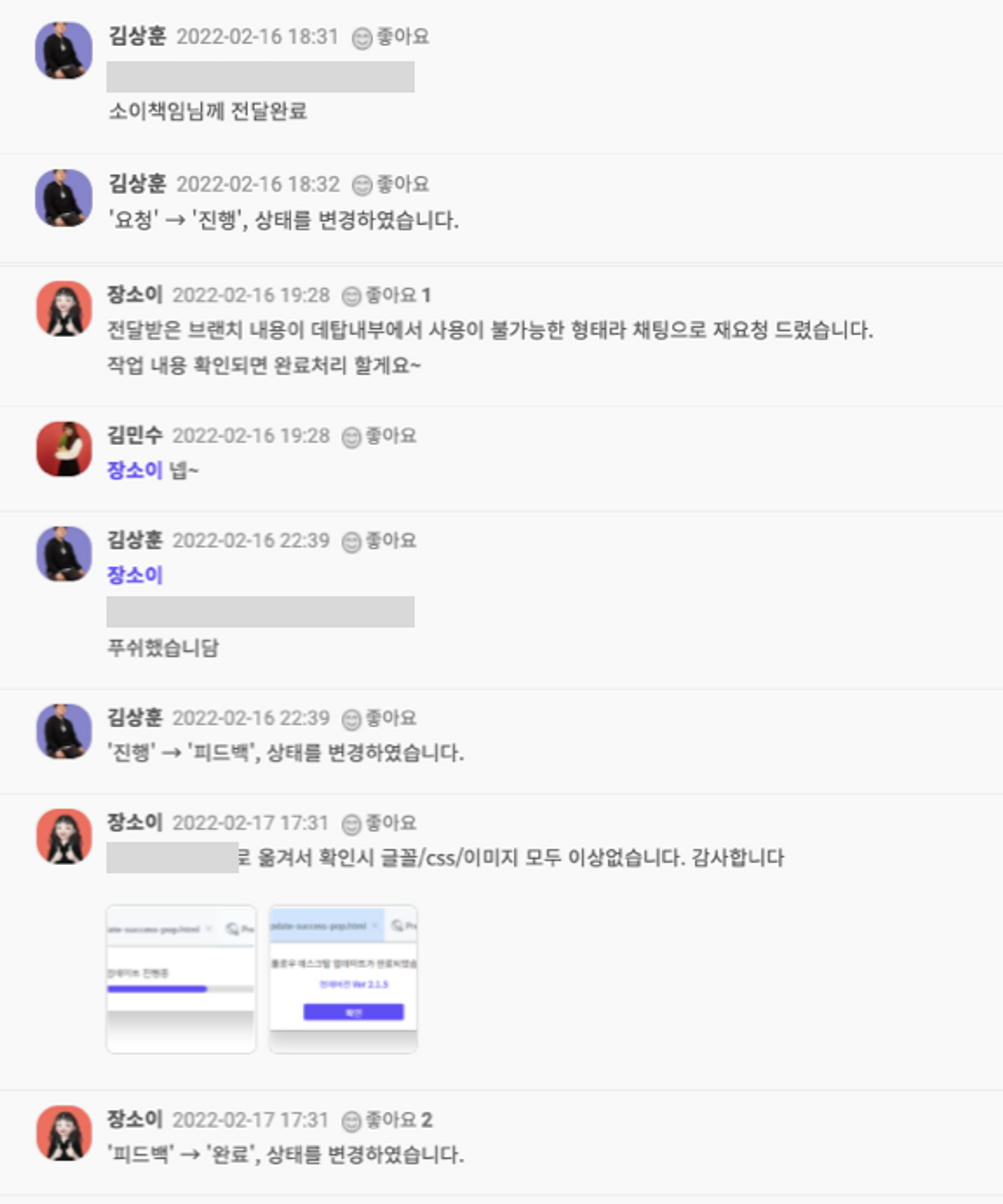 나의 회사의 경우 각각 세분화하여 등록된 업무에 진행상태, 담당자, 시작일, 마감일, 우선순위, 진척도 등을 협업툴을 통해 누구나 수정할 수 있다. 각각의 항목을 수정했을 땐 관련 구성원들에게 알림이 실시간으로 공유되며 누가 언제 무슨 이유로 수정했는지의 히스토리를 그대로 남긴다. 회사 내 모든 구성원의 업무 진행 상태를 직접 찾아가거나 회의를 열지 않아도 클릭 몇번이면 바로 확인할 수 있다.