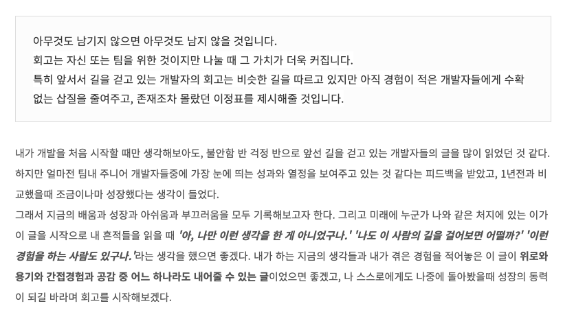 첫 개발자로서의 시작이 꽤나 불안하고 어려웠었지만 치열했던 1년이었고, 나와 비슷한 길을 걸어가려는 사람에게 좋은 이정표가 될 수도 있겠다는 생각으로 작성했던 첫 개발자로서의 회고록이었다. 그때는 지금보다 개발에 대한 철학(?)이나 가치관이 생기기 이전이었기 때문에, 좀 더 날 것의 감정과 상황이 담겨있던 것 같다.