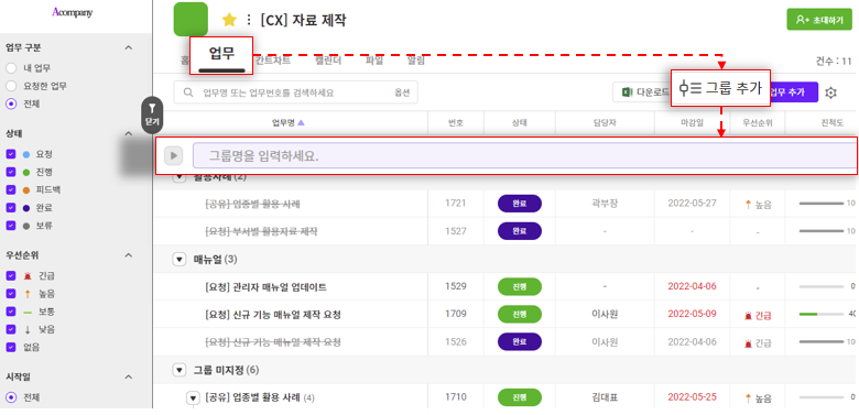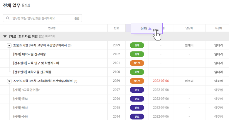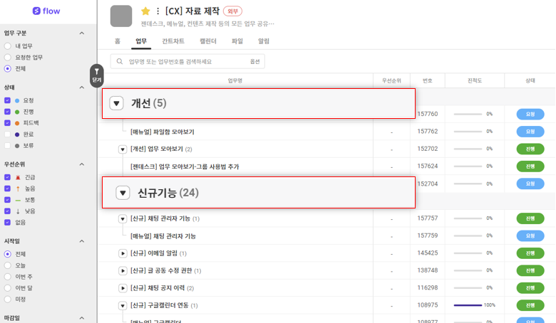 - 그룹/상하위/필터/정렬 등의 기준을 '전체업무'와 동일한 수준으로 변경