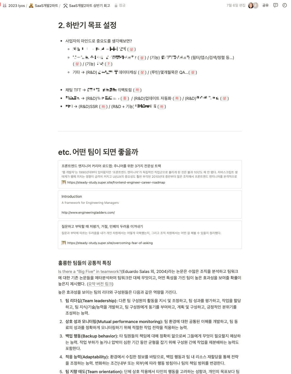 그리고 얼마 전 6월 말에는 상반기에 작성한 목표를 토대로 얼마나 달성했는지 각자 회고하고 공유하는 시간도 가질 수 있었다. '측정할 수 없다면 관리할 수 없고, 관리할 수 없으면 개선시킬 수도 없다.'라는 대학교 1학년 교양수업에서 배운 진부한 말이 이렇게나 실용적인 말인지 처음 알았다.