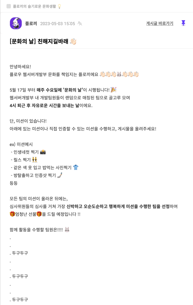 조직의 소통과 문화를 리딩하는 역할로 주어지는 CA라는 제도가 새로 생기면서, 내가 웹서버 개발부의 CA로 선정되었다. 우리 개발부의 경우 인원이 많아 2명이 선정되었는데, 실명으로 진행하면 '장소이'라는 사람과 소통하는 기분이 들지는 않을까 싶어 '플로끼'라는 가상의 캐릭터를 만들었다.