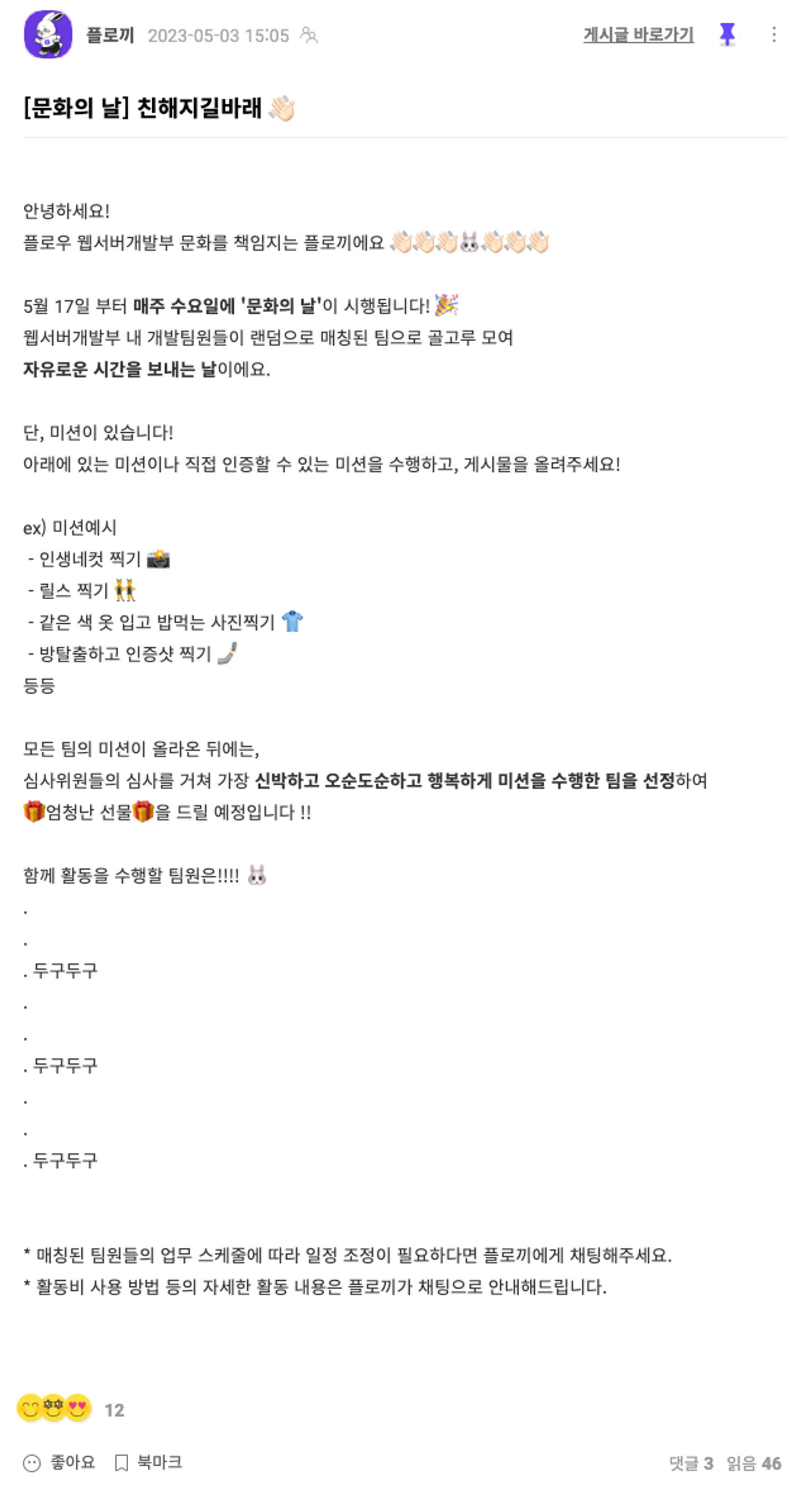 워낙 조직의 변화도 많고 업무도 바쁜터라 개발자들간의 소통이 많지 않다고 느껴왔다. CA 활동으로 ‘친해지길바래’라는 문화의 날을 만들어 소통의 기회를 늘려주려 노력했다.