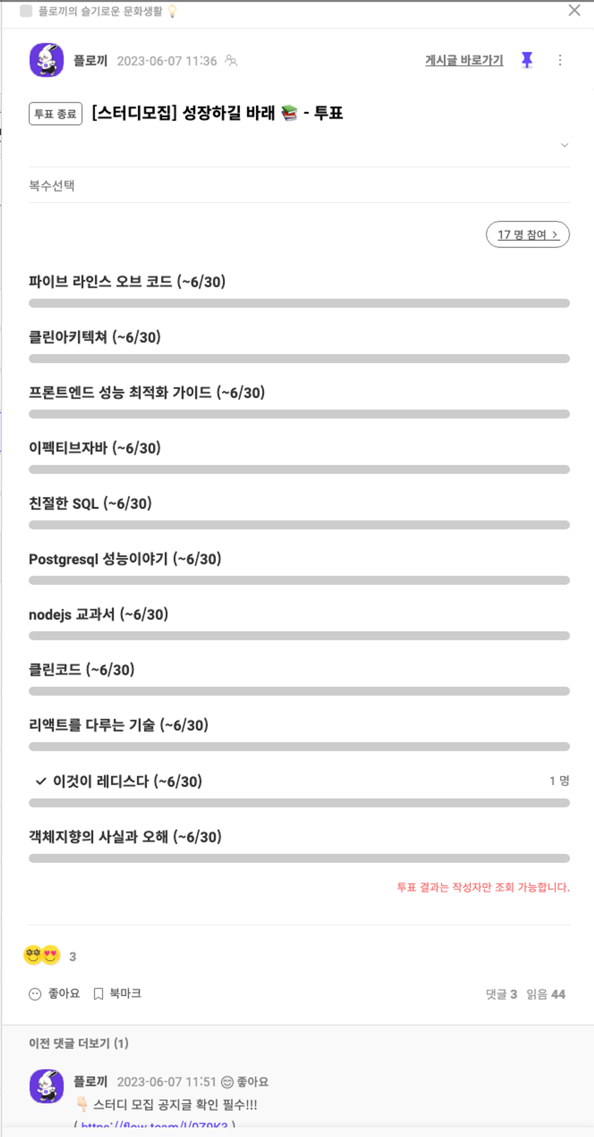사내 스터디 문화를 본격적으로 활성화 시켜야 겠다는 생각이 들었다. 플로끼 아이디로 모집을 시작했고 사내 스터디가 총 4개가 개설되었다.