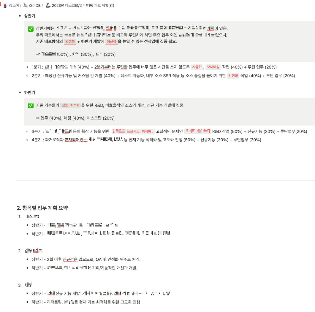올해 초에는 연간 파트 계획을 세웠다. 지금까지 우리 회사는 쉴 틈 없이 업무가 휘몰아쳐서 개발자들은 쳐내기에 급급한 문화가 없지 않아 있었고, 그런 상황 속에서 신입 개발자가 본인이 생각하는 개발적 목표나 방향성에 대해 시간을 갖는다는 것이 쉽지 않다고 느껴왔다. 그래서 아무리 업무폭탄이 내려오는 상황에서도, 그 안에서 얻어야 하는 것들과 그 이후에 우리가 해 나가야 하는 것들에 대해 함께 인지하는 과정이 필요하다는 생각에 연간 계획이라는 소재를 활용한 것 같다. 그리고 당장은 힘들고 고되다고 생각되는 업무를 맡게 되더라도 그 업무가 단지 아무나 해도 되는 루틴한 업무가 아닌, 사업적으로나 서비스 전체적으로 얼마나 중요한 일인지, 앞으로는 어떤 방향으로 개선해나가면 좋은 업무인지 등에 대해 알고 있으면 더 주체적으로 할 수 있지 않을까 싶어 이야기하는 자리를 마련했다.