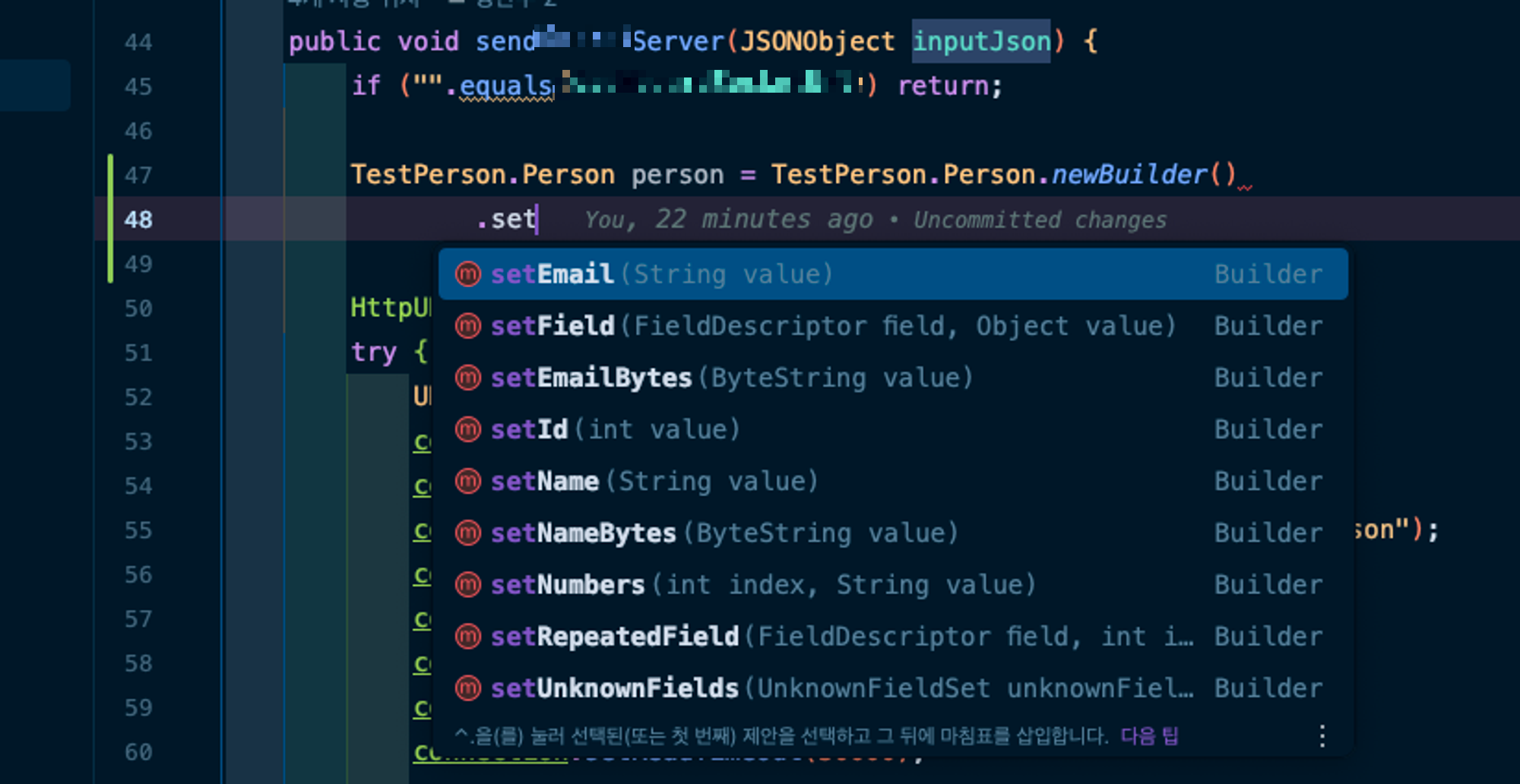 메세지 타입에 있는 newBuilder()라는 메소드를 이용해서 테스트해볼 수 있다. 모든 required 필드를 작성한 이후에 build() 메소드를 호출하면, Person 클래스를 만들수 있다.