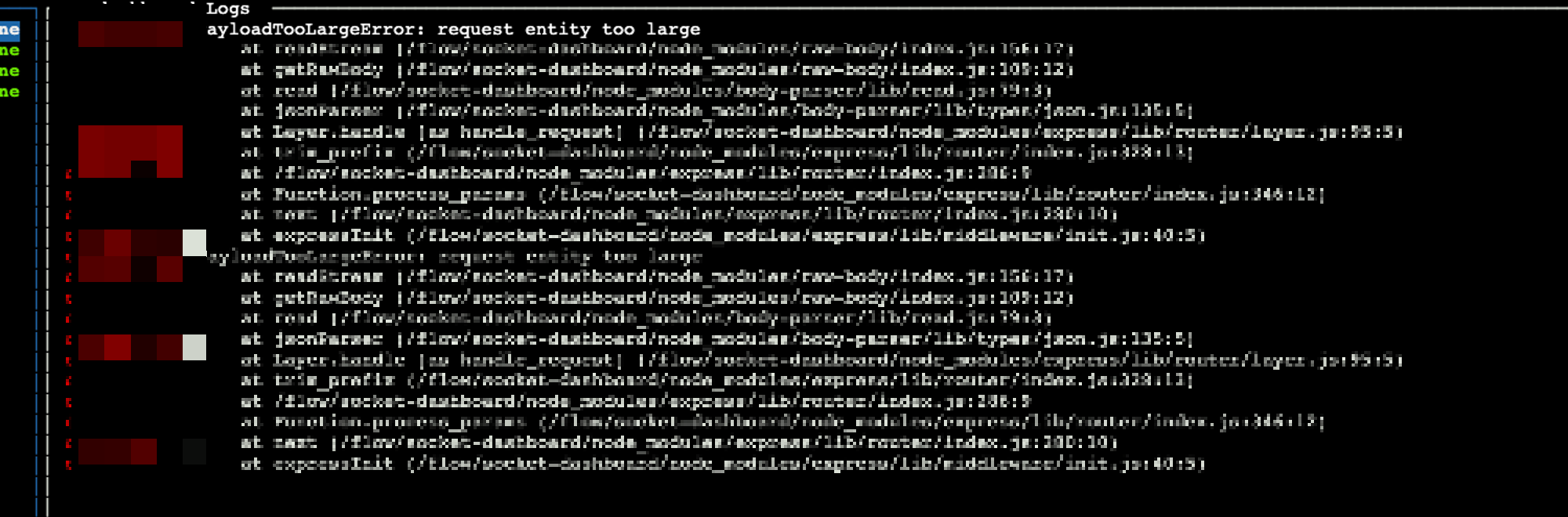 PM2 로그를 통해 본 서버로그에 아래와 같은 문구가 엄청나게 많이 찍히고 있고 파일이나 크기가 큰 리스트를 주고받는 경우도 많았기 때문에 실시간 서버에 들어오는 데이터의 크기를 의심하고 리퀘스트 파라미터를 처리하는 개선 작업을 진행해보려고 가닥을 잡았다.